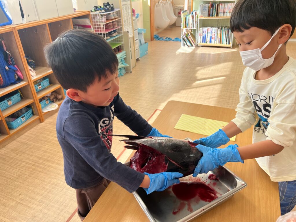 マグロは泳ぎ続ける生き物であることや、頭部・内臓・胃など、普段は目にすることのない部位について丁寧な説明を受けながら、子どもたち一人ひとりがじっくり観察できる貴重な学びの時間となりました。
